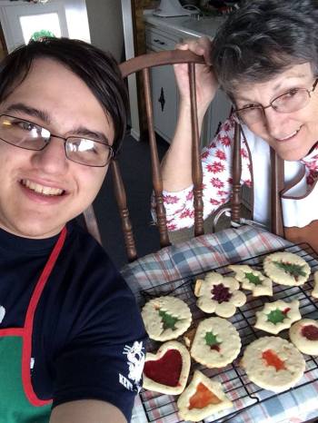 When my nephews were little, I suggest to my mom that we have a cookie baking day. Many hands making light work and all. Between us we had four households and I thought if we all worked together we could have a great variety of treats without all the work and without having cookies until summer. This suggestion was a hit and for the next several years we got together one day of the holiday season and baked up a storm, while catching up, playing with the boys, and eating chili, which my mom made every year to balance out the amount of sugar we were eating. I treasure the memories of those days. Over time the tradition ended though. I went overseas for a few years. The boys grew up (as you can tell by the picture of oldest nephew and my mom.) It’s sad to see these things end, but it does mean they can be replaced with new traditions.